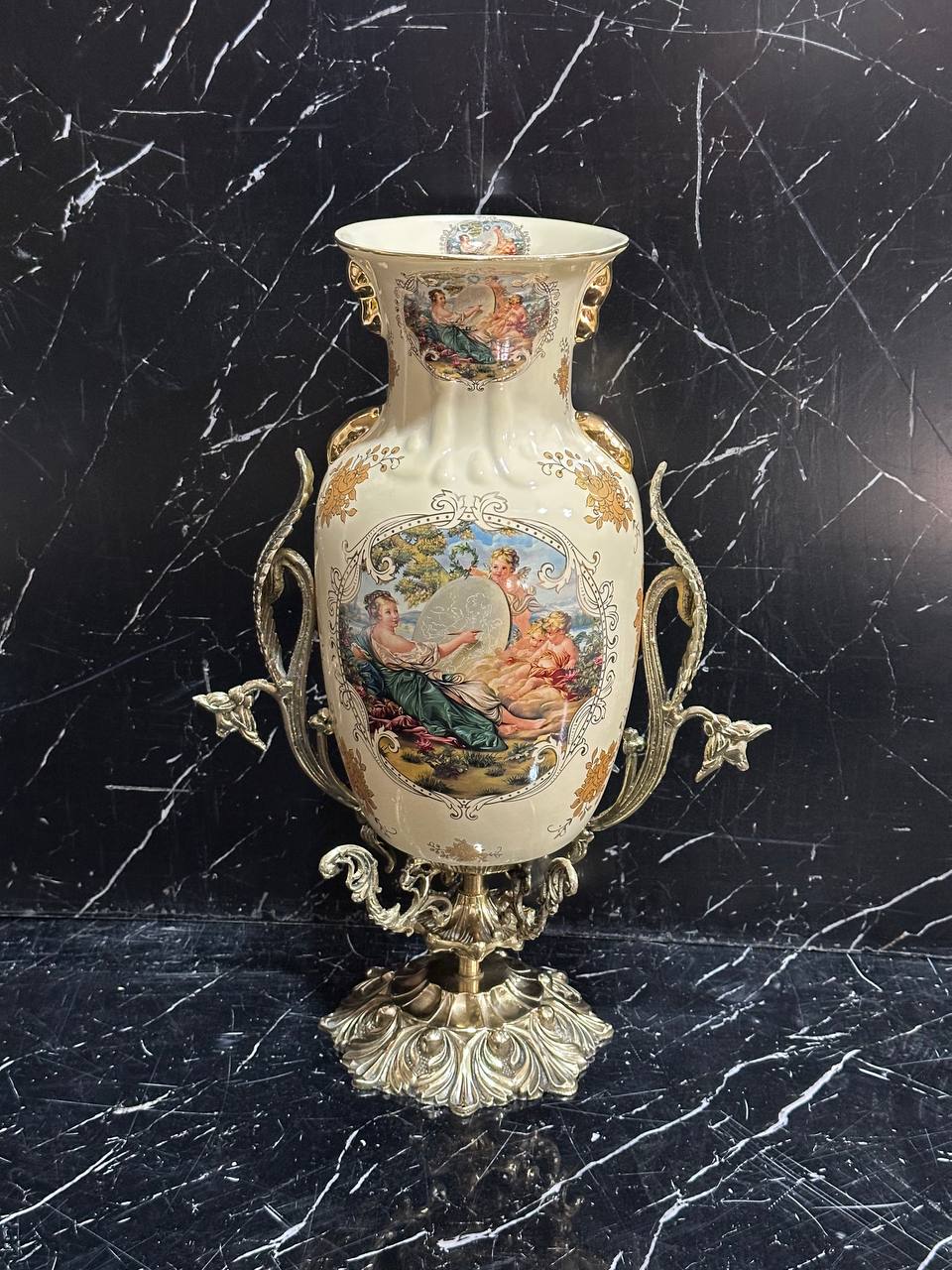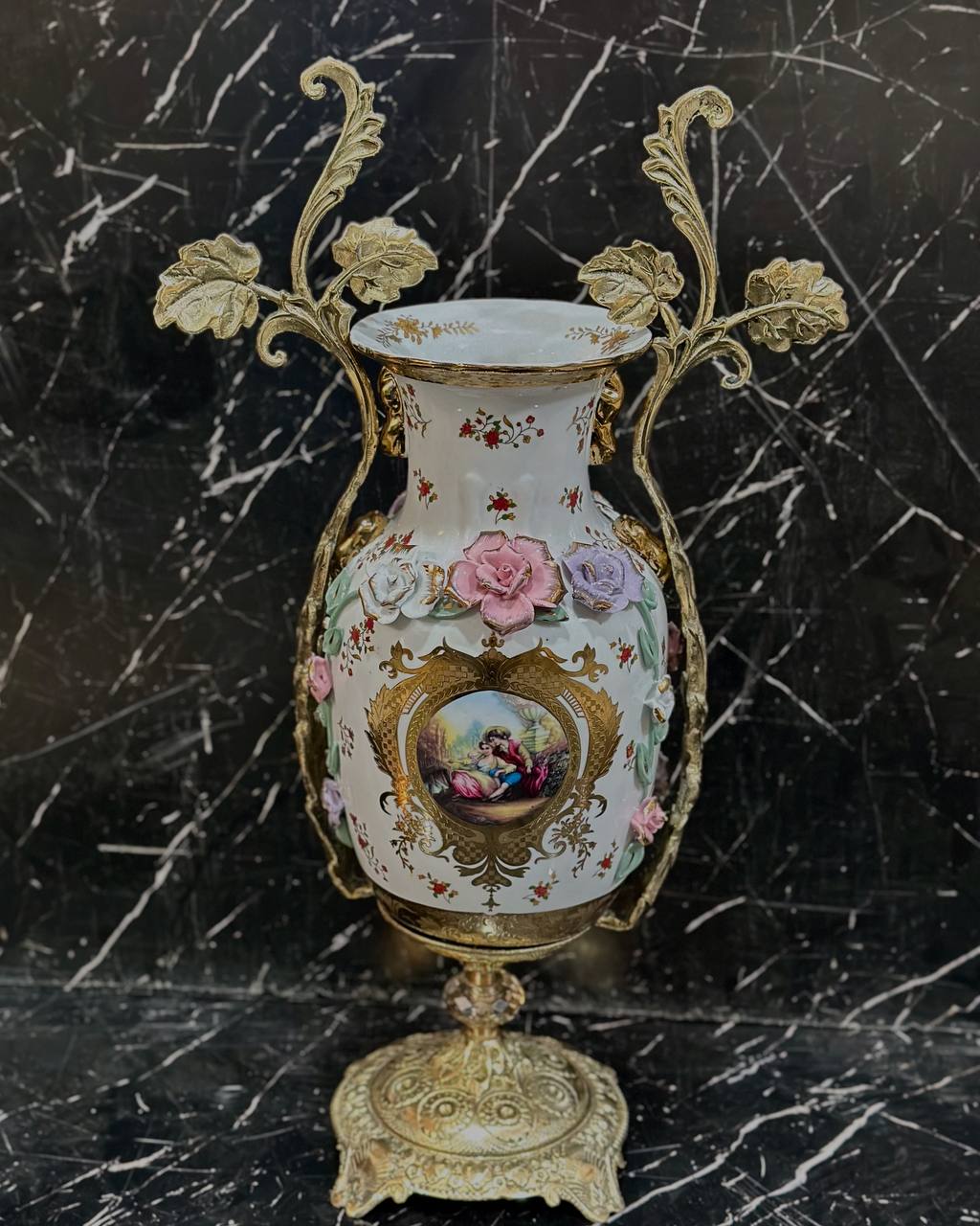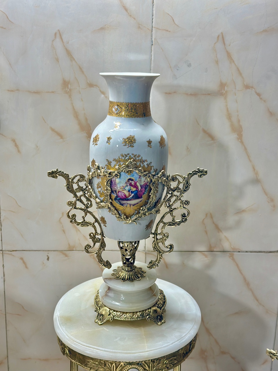 گلدان رومیزی چینی طلا کوب وارداتی دسته برنزی پایه سنگی