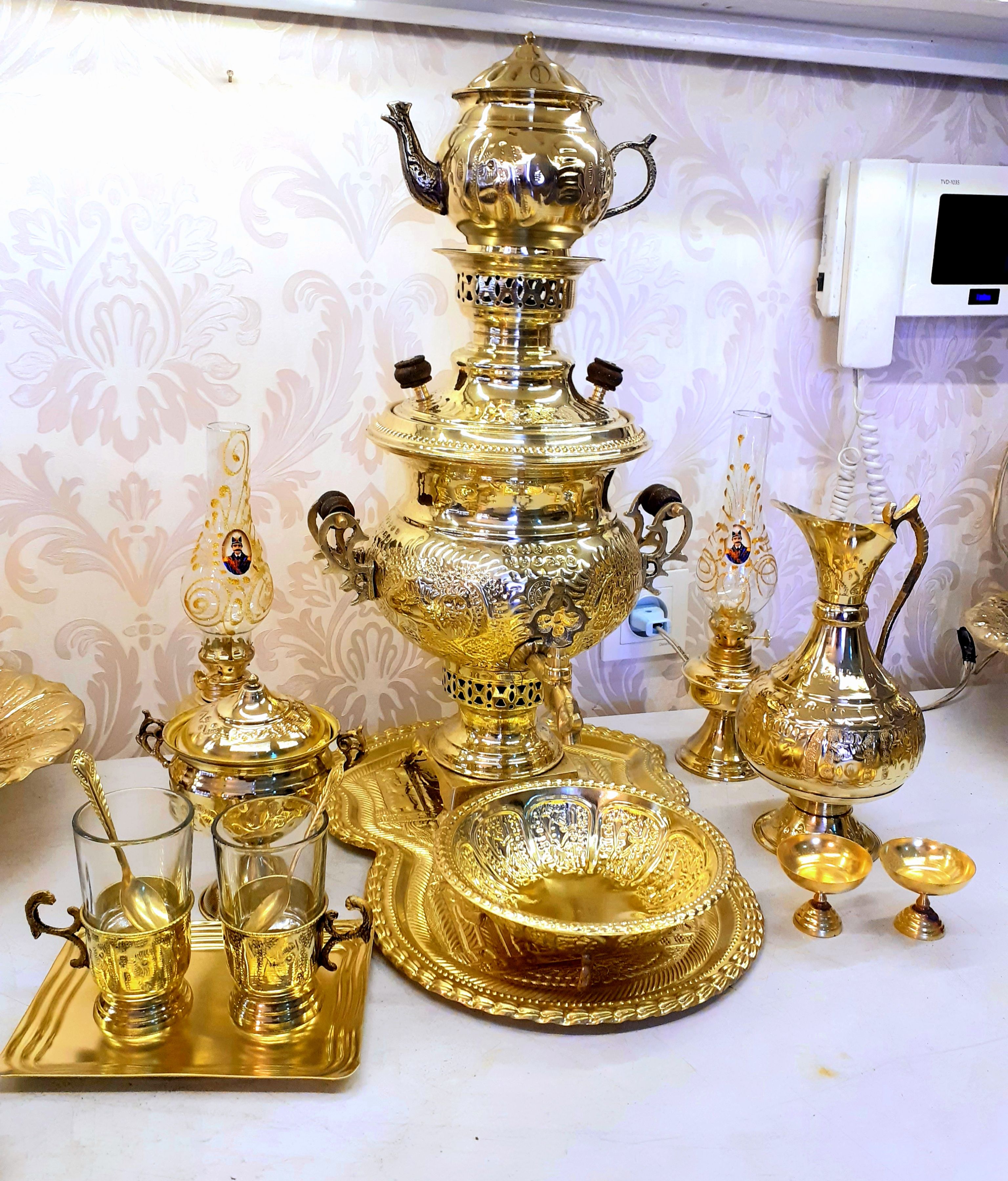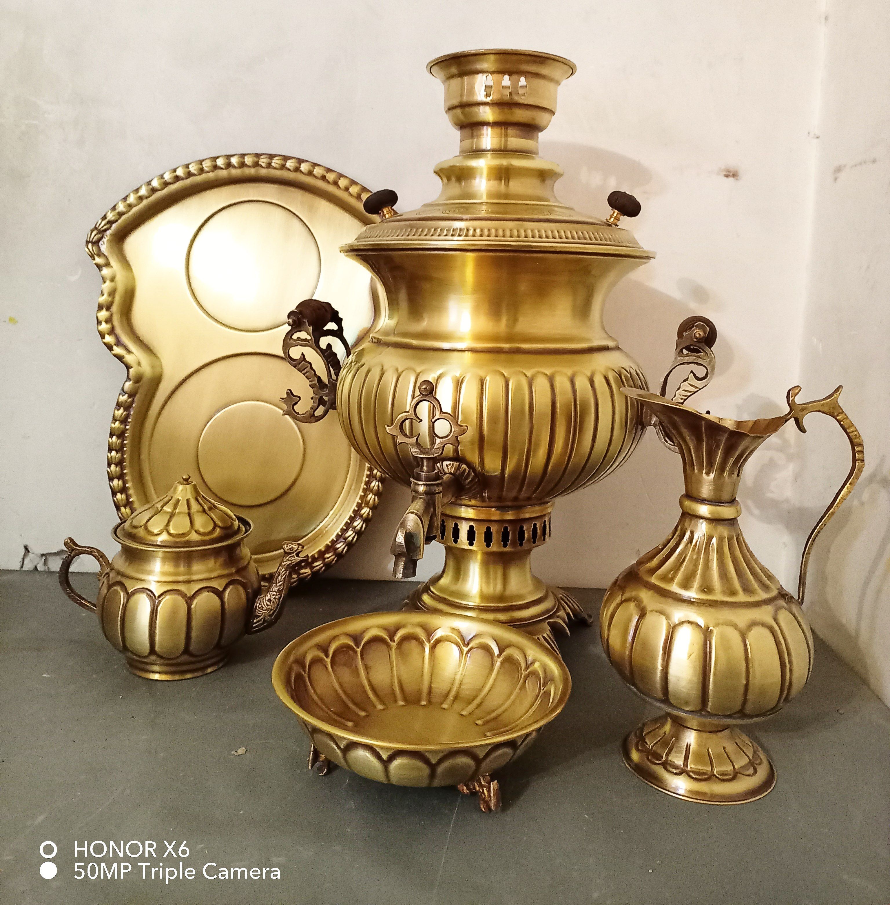 سماور ذغالی برنجی قلم زده 4 لیتری با سرویس 15پارچه ورق سنگین