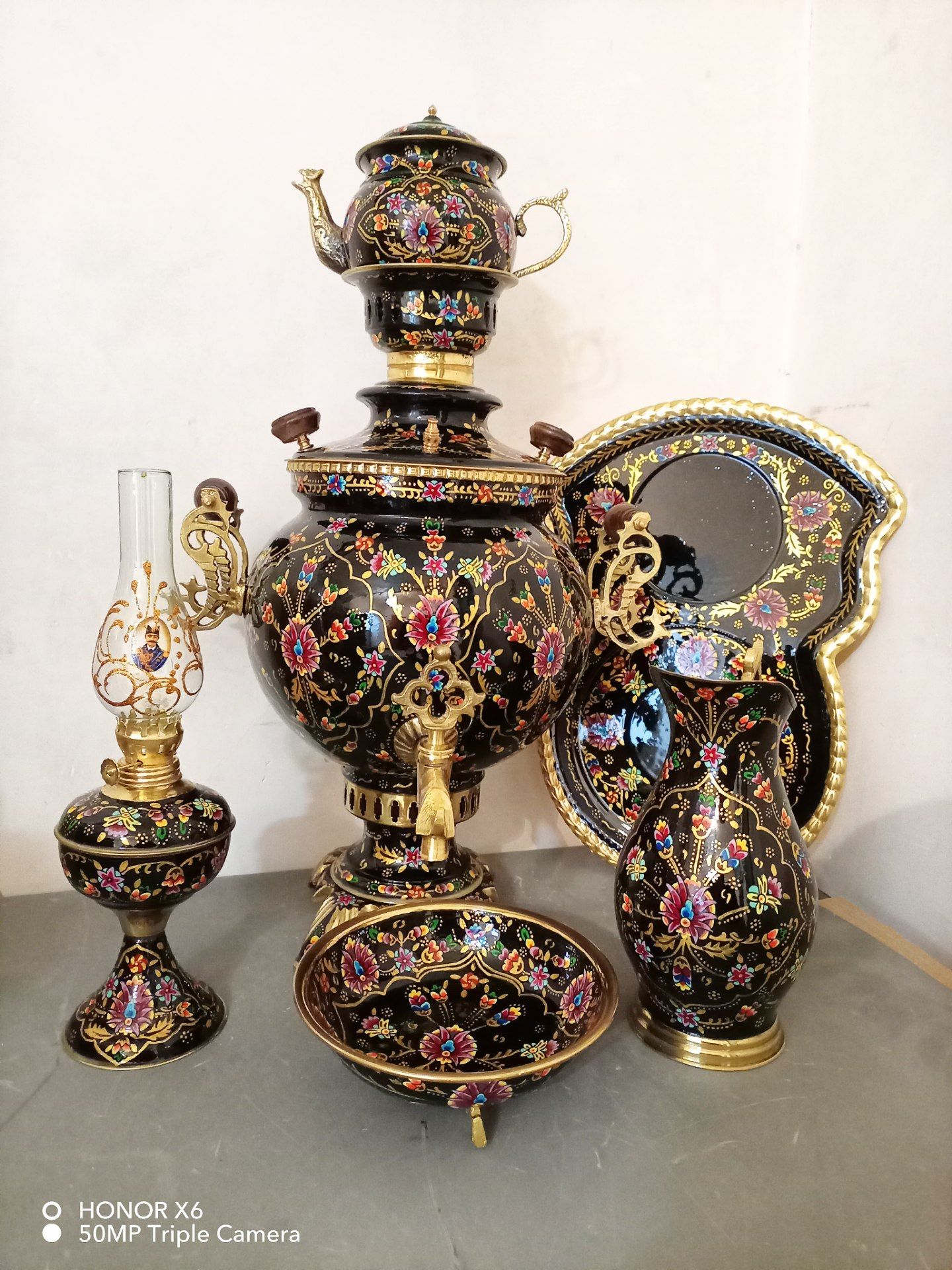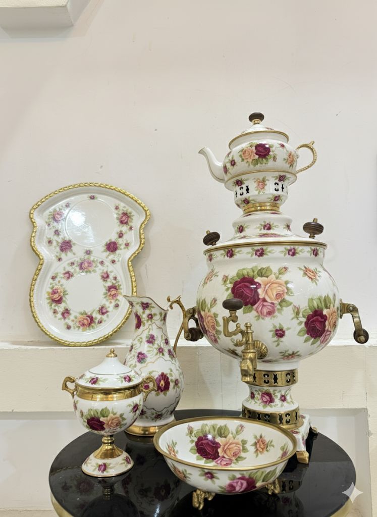 ست سماور ذغالی 6 لیتری توپی سنگین میناکاری صادراتی طرح گل مینیاتوری