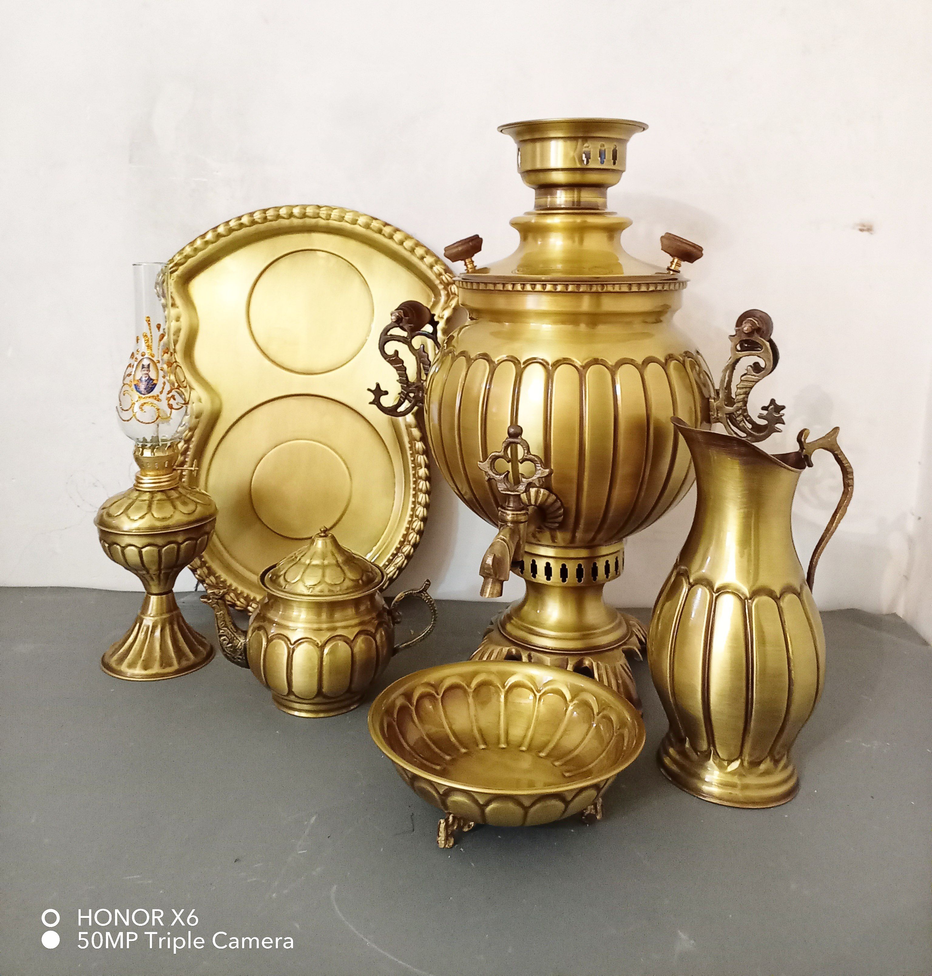 سرویس سماور زغالی برنجی 6 لیتری قلم زده آنتیک