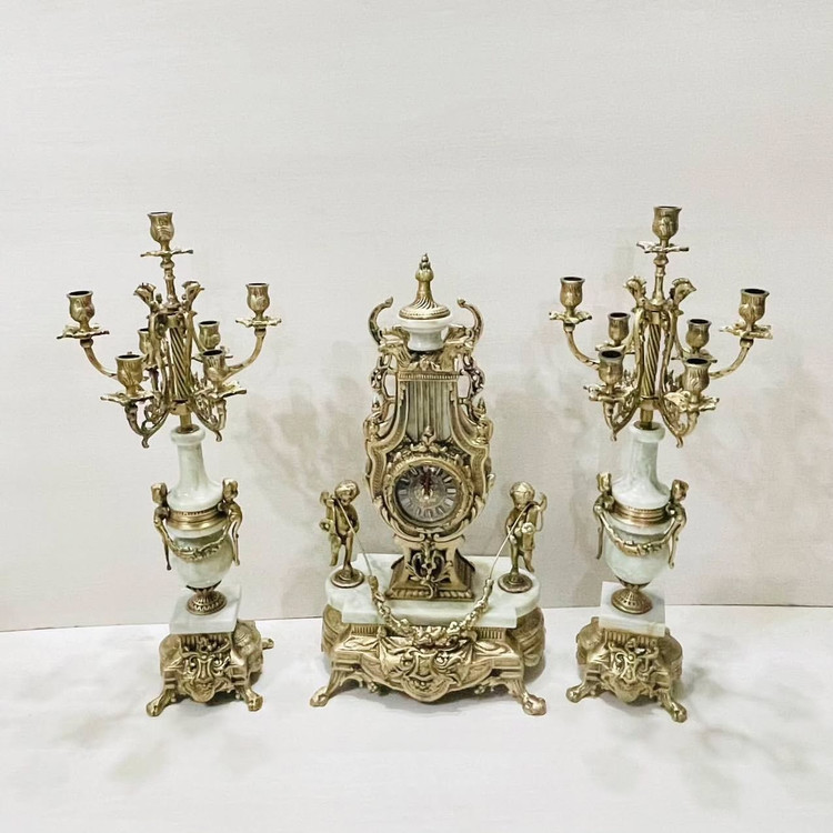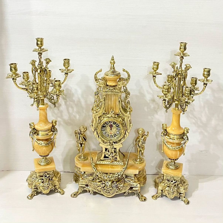 ساعت شمعدان برنز ترکیب با سنگ طبیعی مدل خروسی قالب سنگین