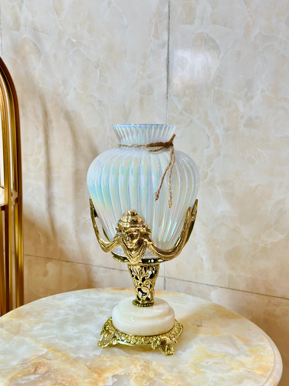 این گلدان لوکس با پایه سنگی مستحکم و ستون برنزی ظریف، جلوهای باشکوه و چشمنواز به دکوراسیون شما میدهد. بدنه بلور گلدان، زیبایی گلهای طبیعی و مصنوعی را دوچندان کرده و آن را به انتخابی عالی برای دکوراسیون کلاسیک و مدرن تبدیل نموده است.