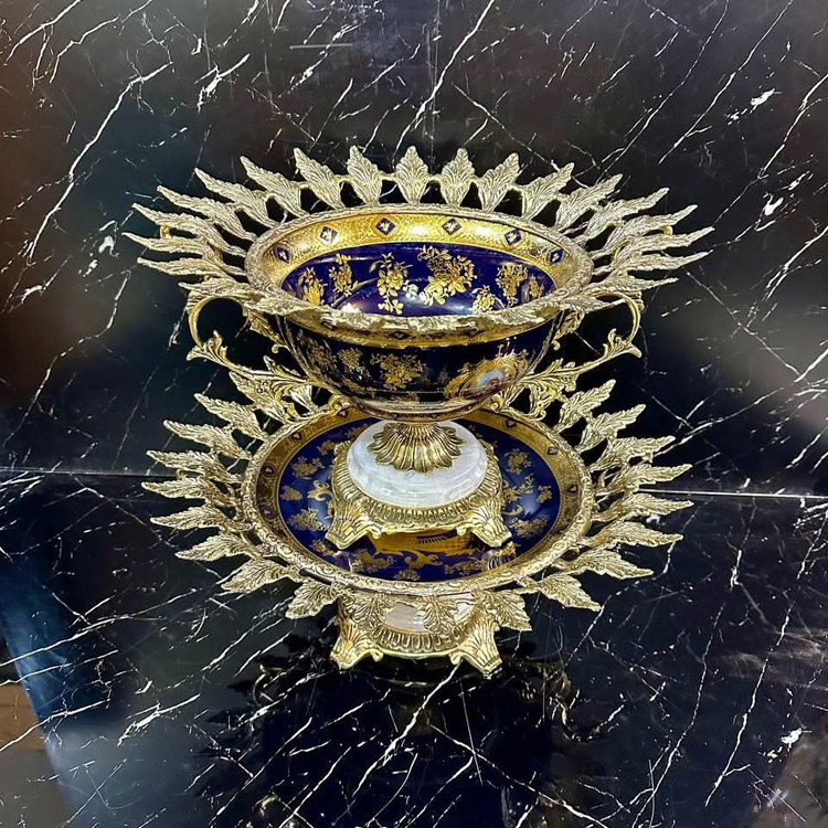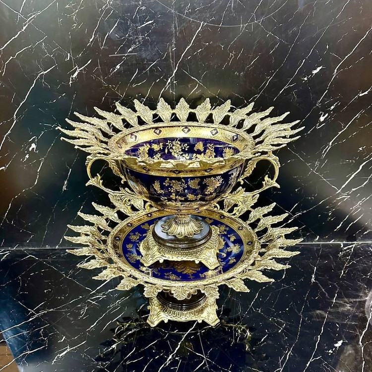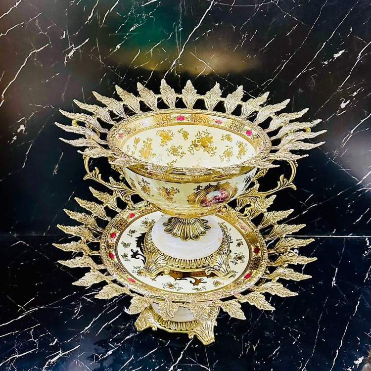 کاسه بشقاب چینی سفید و سرمه ای وارداتی مدل برگی با پایه سنگی و برنز اصل