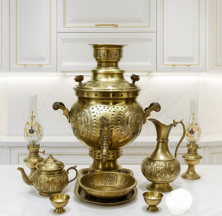 9 پارچه شامل سماور،سینی،پارچ،قوری،کاسه ،یک جفت چراغ ، یک جفت قند پهلو
