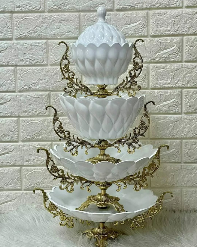 ست پذیرایی سفید ارتفاع شیرینی خوری 16در 32 ارتفاع میوه خوری 20 در 30 ارتفاع آجیل خوری 21در 24 ارتفاع شکلات خوری 31 در17